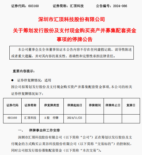 汇顶科技公告显现,公司贪图以刊行股份及支付现款阵势购买云英谷的戒指权,并拟刊行股份召募配套资金。